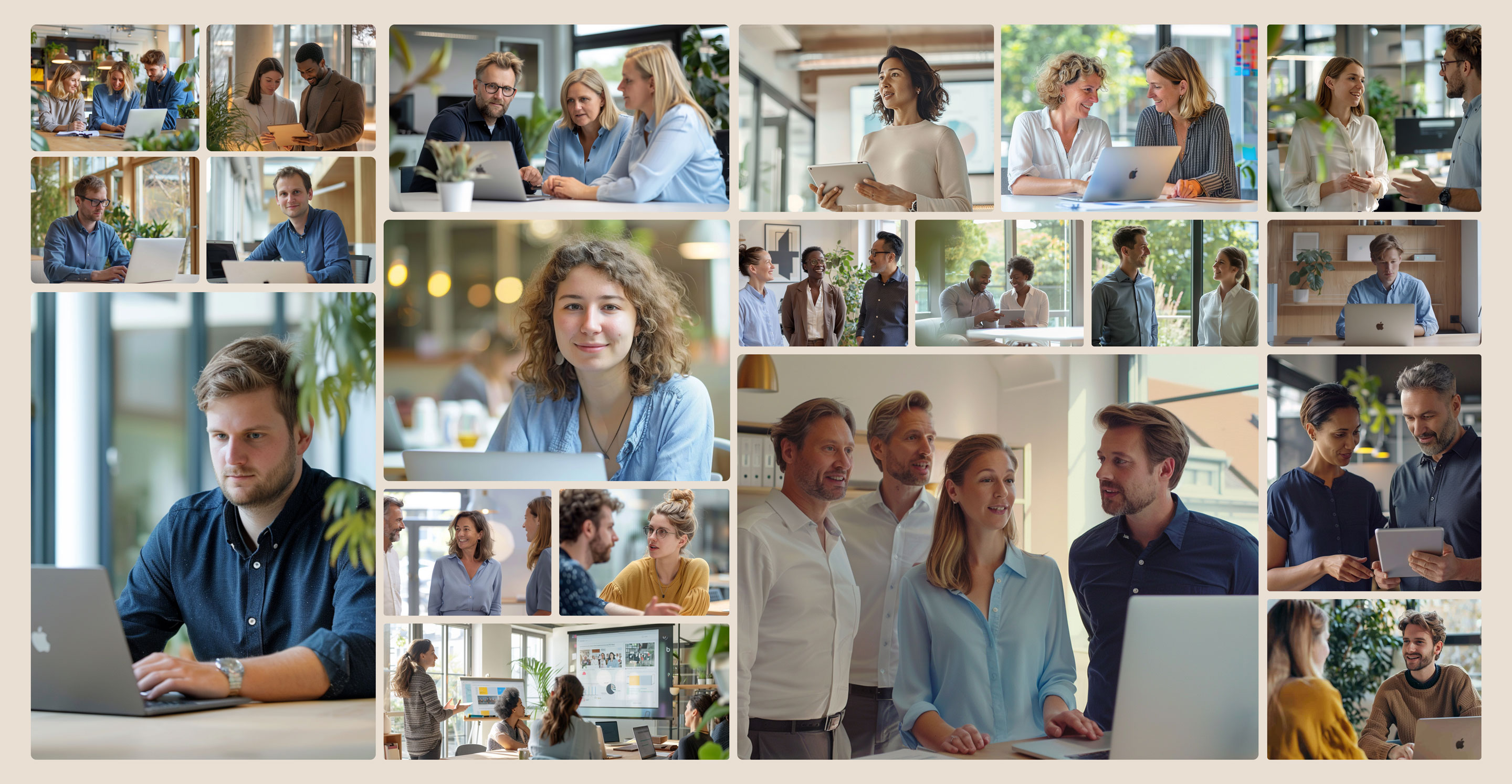 Die KI-Bildwelt zeigt Personen unterschiedlichen Alters, Geschlechts und Ethnizität. Durch die warme und helle Bildstimmung entsteht eine visueller Klammer.