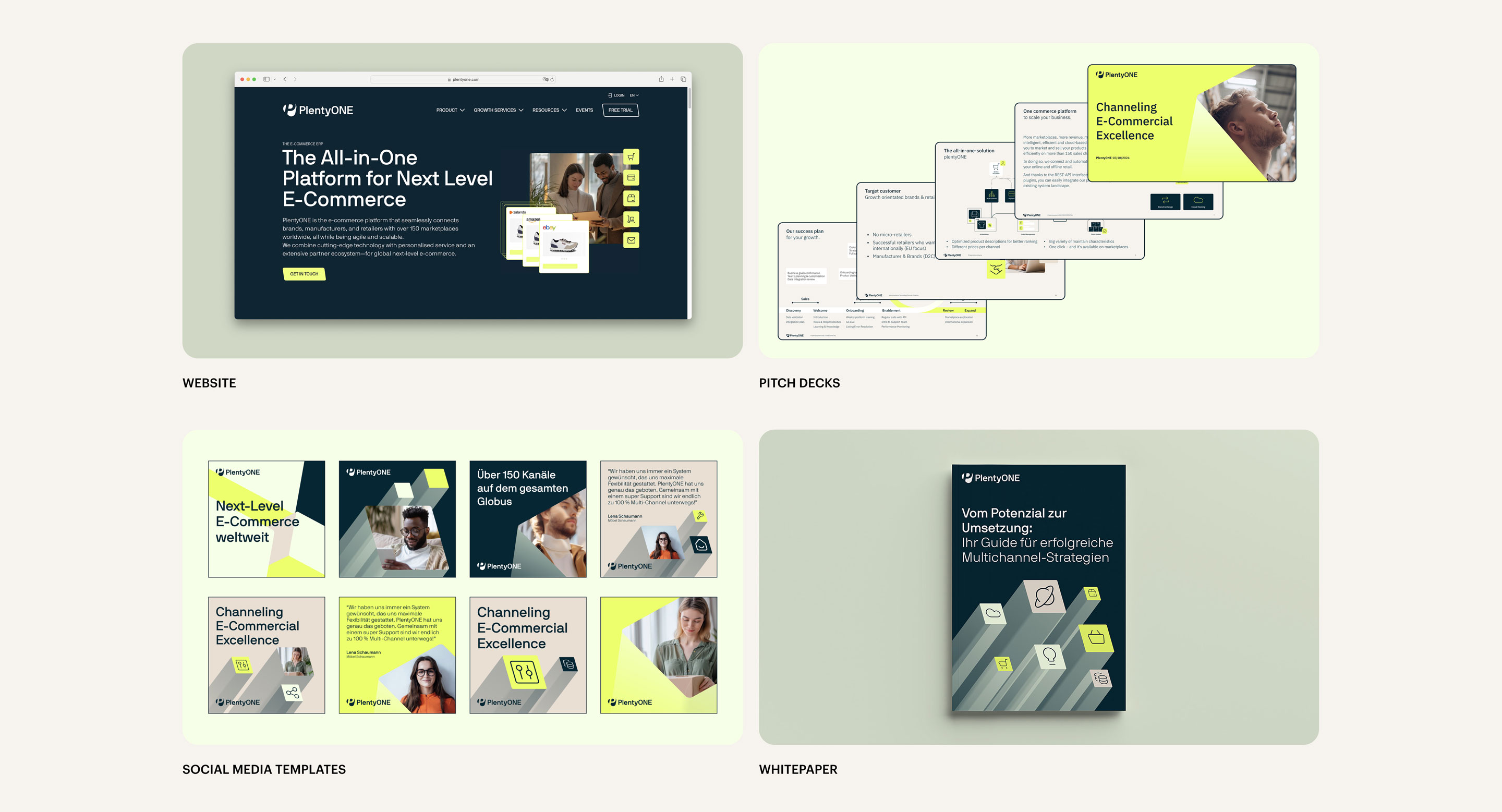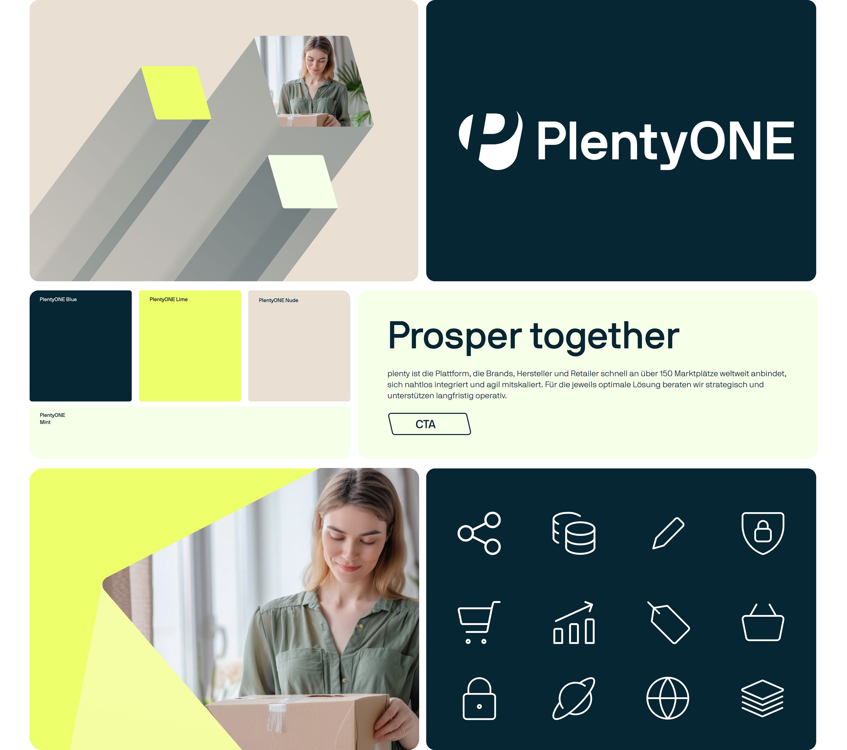 Formsprache macht das Markenversprechen erlebbar: Größer, besser, intelligenter – schneller. Farben und Schrift positionieren PlentyONE im technologischen Kontext.