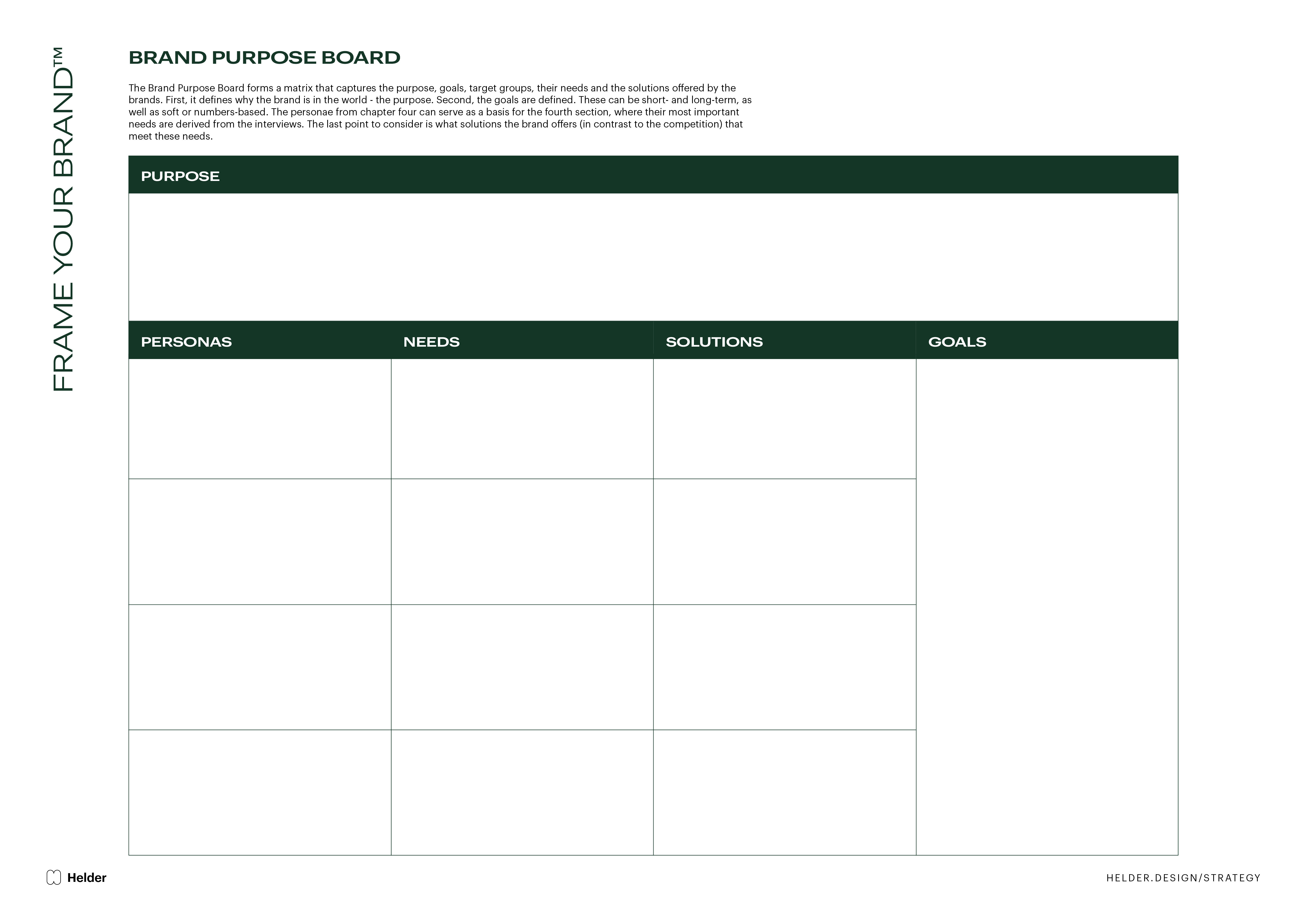 Social ideals are changing, and with them the expectations placed on companies. Consumers are increasingly interested not only in their own benefits but also in the social value added by a brand. A purpose statement helps potential customers to align environmental and social values with those of a company. The Brand Purpose Board is a matrix that helps visualize and align intrinsic motivation and corporate goals with target groups, their needs, and the solutions the brand offers.