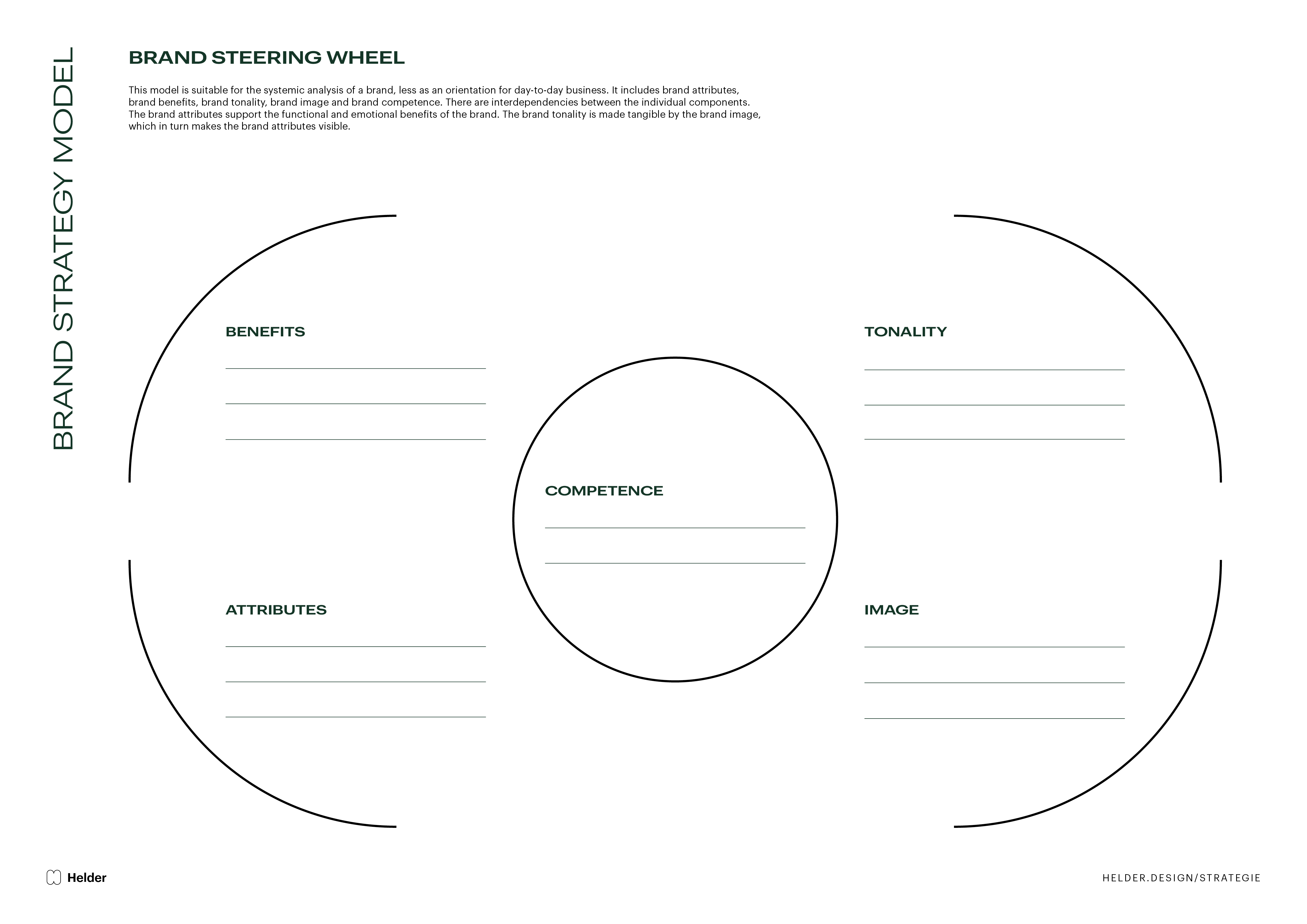 This model is suitable for the systemic analysis of a brand, less as an orientation for the day-to-day business. It includes brand attributes, brand benefits, brand tonality, brand image and brand competence. There are interdependencies between the individual components.